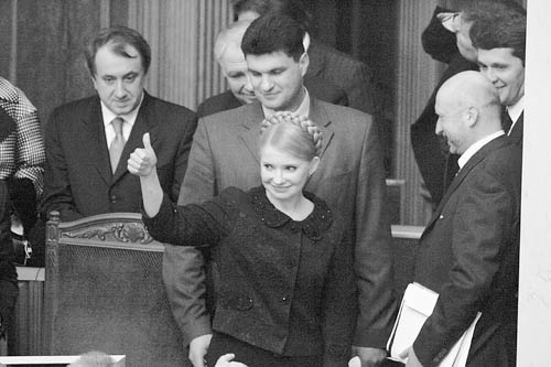 2月5日,在乌克兰首都基辅,乌总理季莫申科(前)在议会投票后高兴地向议员们竖起大拇指。乌克兰议会当日投票否决了由最大反对党地区党提出的对政府不信任案,总理季莫申科领导的内阁得以继续留任。