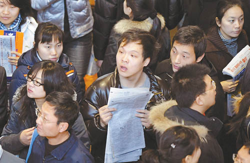 吉林大学工商管理专业08届毕业生孙艳君辞掉在河南的工作,正月初八,就与高中同学李洁丽一起到北京租房找工作,便携本上密密麻麻记着北京各个招聘会的日程。8时10分,她到达农展馆,随即被汹涌的人流推进会场。