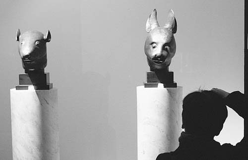 2月21日,一名记者在巴黎大皇宫拍摄预展中的鼠首和兔首铜像。