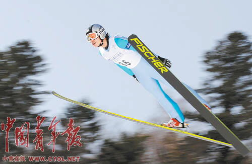 2月21日,韩国选手金贤基在比赛中。当日,在第24届世界大学生冬季运动会跳台滑雪男子K90米个人赛中,金贤基以261.0的总分获得冠军。