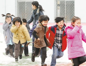 2月23日,开学第一天,河北省秦皇岛市迎秋里实验学校举行紧急疏散演练,学生们在老师引导下从教室紧急撤离。 刘光昱摄(新华社发)