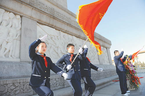 4月1日上午,天安门广场,来自北京市27中学的6名少先队员代表在人民英雄纪念碑前,为人民英雄站少年先锋岗,由此拉开了今年首都少年先锋岗活动的序幕。