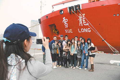 4月3日,一群高雄中学生在“雪龙”号前拍照留念。