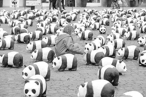 4月4日,一名小女孩在法国西部城市南特的一个广场上抚摸纸制熊猫。当天,世界自然基金会在南特摆放了1600个纸制熊猫,旨在号召人们行动起来,拯救濒危物种,改善日益恶化的环境。
