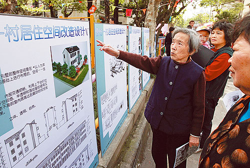 4月25日,几位老人在观看学生的设计作品。当日,“上海·艺术让城市更美好”曹杨新村公共艺术展在中国最早的工人新村——上海曹杨新村拉开帷幕,上海大学美术学院学生以曹杨新村为背景设计的作品被安置在街头花园,接受居民们“评头论足”。这些设计引发了曹杨新村居民对于改造旧住房的迫切愿望。据悉,当地街道将对老公房的内外墙、小区道路等进行翻修,并逐步满足居民改善居住条件的愿望。 新华社记者 任珑摄