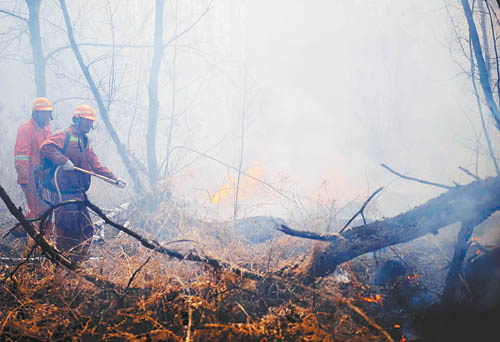4月30日,在黑龙江省逊克县大平台乡(伊春林业施业区内),两名扑火队员在灭火。截至4月30日10时,火场涉林总面积已达2万公顷,投入总兵力7530人。动用各类飞机12架,其中直升机7架,并有31台挖掘机、推土机运赴火场。