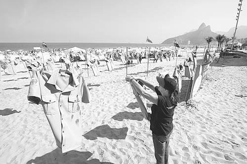 5月13日,在巴西里约热内卢的伊帕内马沙滩上,抗议杀害警察的民众将染血的军警制服悬挂起来,以示悼念。据抗议活动组织者介绍,这些制服代表了在过去28个月里殉职的58名里约州警察。抗议者们还打出横幅标语,上面写着“他们的牺牲是为了保护里约人民”。