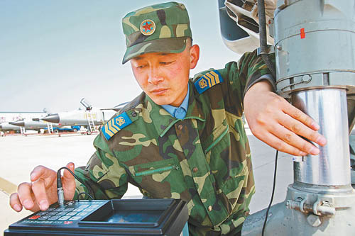 蓝天之下开阔的停机坪上,一排某型战机静伏在那里。五级士官窦树军趴在其中一架飞机狭小的进气道内,拿着5公斤重、抽屉大小的探伤仪,用探头在合金的发动机叶片上游走。他是一名飞机探伤技师。