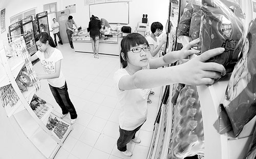5月13日,浙江纺织服装职业技术学院商学院2008级连锁经营与管理班赵燕燕同学(图右)在超市整理货品。当天,由该院出资3万多元,连锁班、营销班和物流班的11名同学联合经营管理的校园“贾记超市”开业了。