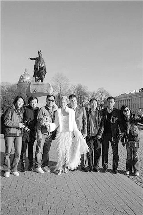 访俄代表团成员在圣彼得堡街头与一对新婚夫妇合影。