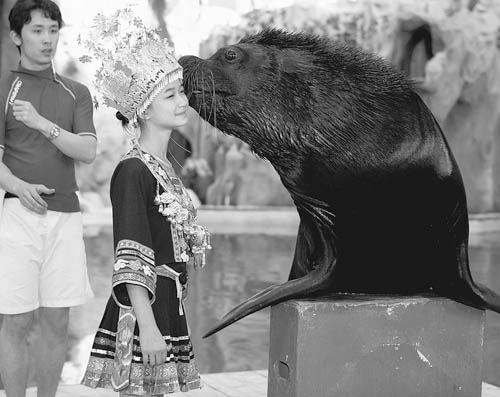 一位少数民族学生代表和海狮Boby亲密接触(图)