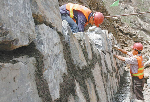 5月30日,两名筑路工人在国道212线482公里处进行加宽路基作业。集结在甘肃陇南地震灾区的万名筑路大军在端午节小长假期间,开展大规模的公路重建会战。今年“5·12”以后,以道路维修、国道加宽、取直、桥梁铺设为主要内容的筑路会战在陇南全面铺开。