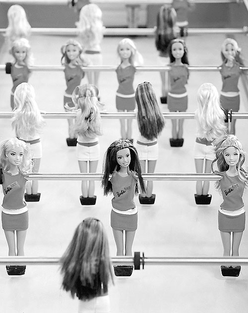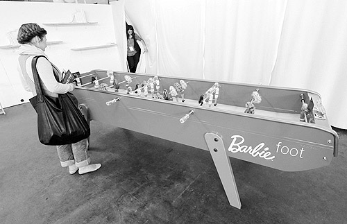 6月4日,一名女子在德国柏林国际设计节上观看展出的芭比桌上足球游戏机(上图)。这款游戏机的足球队员全部采用芭比娃娃造型(下图),引起不少女性球迷的兴趣。新华社/法新