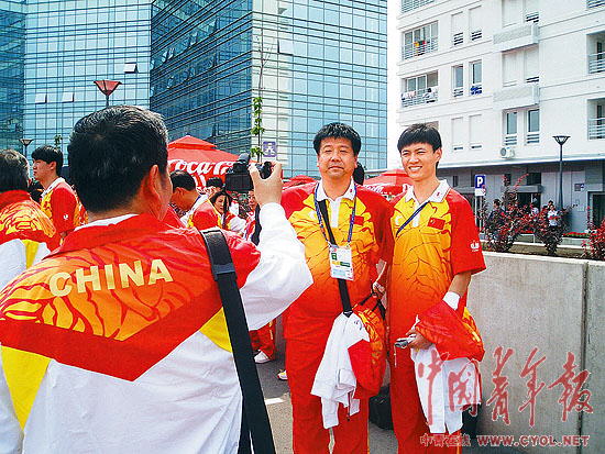 仲满(右)仍是代表团成员争相合影的明星选手。本报记者 慈鑫摄