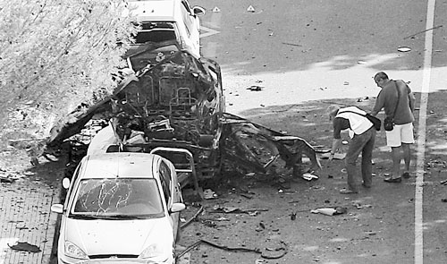 7月30日,调查人员在西班牙马略卡岛的汽车炸弹袭击现场勘查。西班牙马略卡岛当日发生一起针对警方的爆炸袭击事件,造成至少两人死亡。 新华社/法新