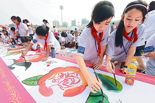 9月12日,3000多名青少年和书画家一起在浙江省温州市体育馆现场绘制长1949米、宽60厘米的巨幅画卷,庆祝新中国成立60周年。庄颖昶摄(新华社发)