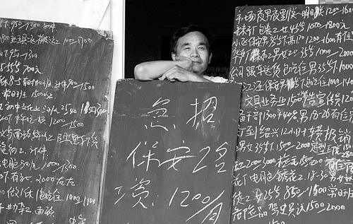 9月1日,浙江嘉兴市区城南路上,一家职业中介工作人员守着众多岗位而无人前来问津,显得有些纳闷。