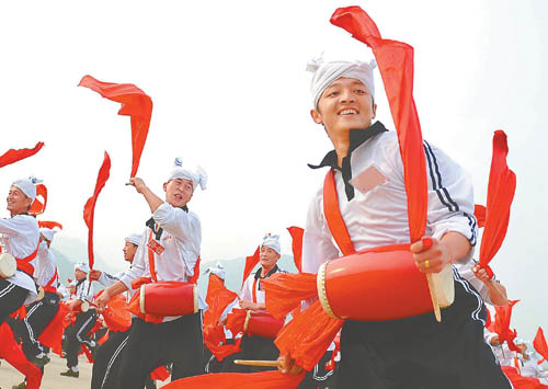 白白的毛巾头上系起来,红红的绸带舞起来,清脆的鼓点响起来,当安塞腰鼓方阵伴着《没有共产党就没有新中国》的音乐节拍行进到主席台前时,1020名腰鼓队员成了所有人的目光焦点,许多人情不自禁地站起来,和着音乐节拍为这些舞动的演员鼓掌。