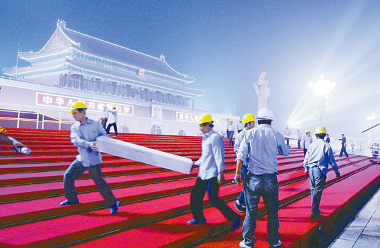 9月25日晚,工作人员在天安门城楼前国庆临时观礼台安装座椅,临时观礼台将从原来的站席变为坐席。新华社发