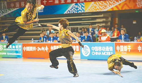 10月14日,天津队在女子对练的比赛中演练双刀进双枪。当日,在山东省滨州举行的第十一届全运会武术套路女子对练比赛中,天津队以9.78分夺得金牌。