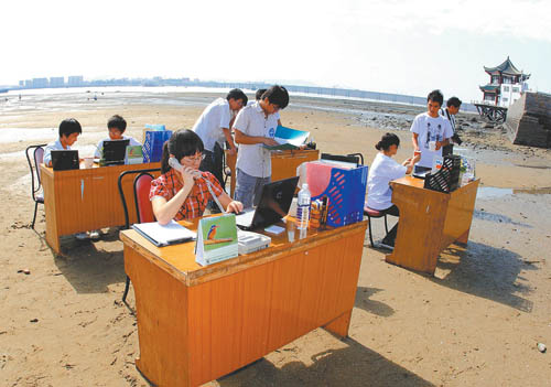10月24日,福建厦门嘉庚公园海边,大学生志愿者在海滩上模仿办公场景。他们用行为艺术的方式提醒公众对气候变暖、海平面上升的紧迫认识。10月24日,世界各地的青年人在互联网上相约开展关注气候变化的活动,涉及170多个国家4000多场活动。