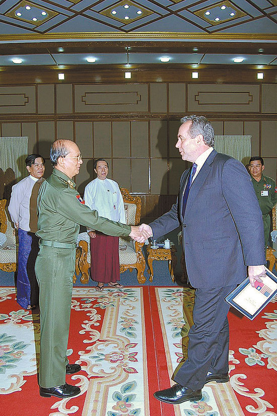 11月4日,缅甸政府总理登盛上将在缅甸新首都内比都会见美国主管东亚和太平洋地区事务的助理国务卿坎贝尔(右)。坎贝尔4日晚在结束访问缅甸前说,美国正准备采取步骤改善美缅关系。 新华社/法新