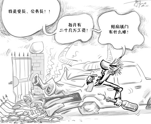 11月7日晚,广州海珠区一辆悬挂警用牌照的轿车肇事。车上男子满口酒气称,“我是党员、公务员”,“每月有二十几万工资”,“赔扇铁门有什么难”。(《广州日报》11月9日)