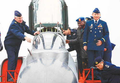 当日,参加中国空军成立60周年“和平与发展国际论坛”活动的32国空军代表在中央军委委员、空军司令员许其亮上将的陪同下赴山东中国空军航空兵某师参观。