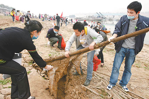 11月8日,湘江长沙段,志愿者在干涸的河床上清理垃圾。据悉,当天两万余名志愿者用近3个小时清理出的湘江河床上的陈年垃圾达50卡车。10月下旬,不少人陆续在网上发帖,召集志愿者对湘江河床上裸露的垃圾进行清理,用自己的实际行动保护湖南母亲河。