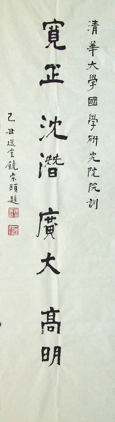 梁先生那句校训,一直是清华人的骄傲,也一直是清华人的修身之本。不过,考虑到梁先生提出的校训,主要是针对大学生群体,而突出一个做人的标准,那么清华国学院作为一个高等研究机构,则应当基于更高的标准,来进一步规范做学问的问题。所以,最终定下的“宽正、沉潜、广大、高明”八字,都涉及对学风的倡导与垂范,它们当然各有经典出处,这里也不必细讲,其实只要想到各自的反义词,就会想到它们在针砭和砥砺什么了——“宽正”是针对“偏激”而言,反对刻意求新而不惜偏激;“沉潜”是针对“浮躁”而言,反对急功近利和浅尝辄止;“广大”在反衬“偏科”,要求思接千载心忧万民,而非为了课题意识而舍弃问题意识;“高明”则在反衬“表浅”,要求既有高远的终极关怀,又有深刻的洞察力。