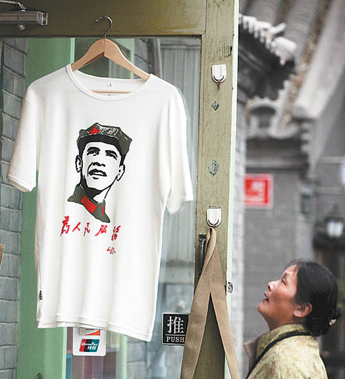近日,一款名为“奥巴毛”的T恤衫出现在北京街头的小店。仔细端详,这个有趣的图案是把美国新任总统奥巴马的脸贴到红军时代毛泽东的木刻画上。本月中旬,奥巴马将首次访华,小店的生意也着实红火了一番。