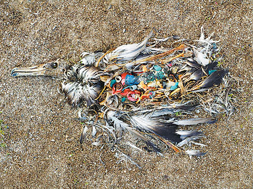 近日,美国著名“垃圾摄影家”克里斯·乔丹和同伴来到位于北太平洋的中途岛,拍摄了因吞食塑料垃圾而死去的信天翁幼鸟尸体的系列照片。在这些照片里,信天翁的皮肉内脏已风化殆尽,只剩下骨架、羽毛和喙,但身体“里面”却堆满了塑料垃圾:打火机、瓶盖、塑料小球、尼龙线、玩具零件。