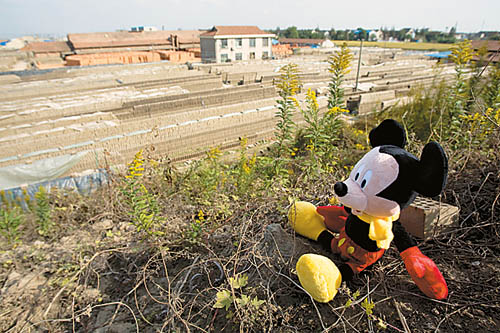 11月4日,上海浦东新区川沙镇旗杆村黄楼窑厂,米老鼠玩偶躺在草丛中。日前,上海市政府新闻办公室被授权宣布,上海迪斯尼项目申请报告已获国家有关部门核准。坐落在这里的迪斯尼乐园预计耗资244.8亿元,征地面积超过6000亩,这将是全球占地面积最大的迪斯尼主题乐园。提起迪斯尼,人们大都会想起以前在电视上看的动画片里米老鼠、唐老鸭等卡通形象。如今在迪斯尼这个被多次复制的欢乐、惊奇、如童话般完美的梦想国度,米老鼠已成为一个催生财富梦想的代号。