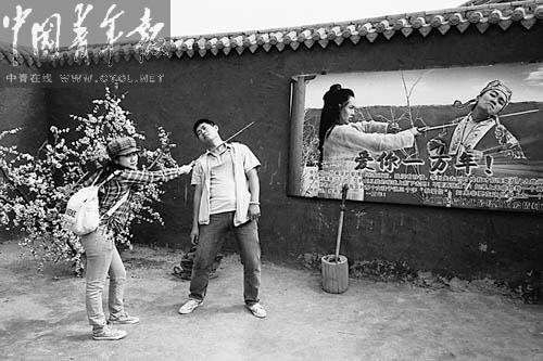 银川镇北堡影片《大话西游》的拍摄地,一对青年人正模仿海报上的画面。