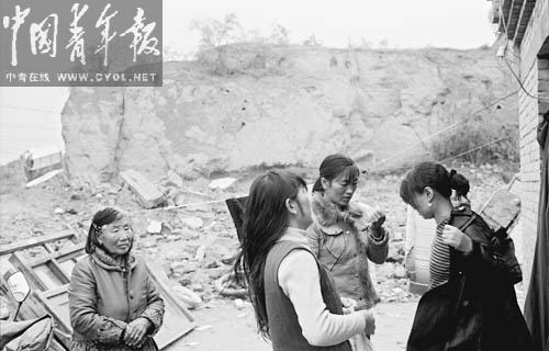 宁夏盐池县城一段旧城墙内,几位女子正试穿新衣。附近平房的拆迁工作已基本结束。