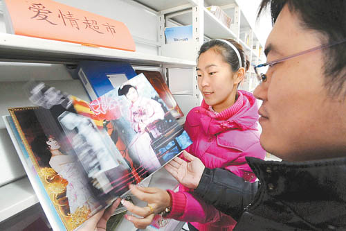 11月11日,一名男青年在“爱情超市”工作人员的帮助下查阅单身女青年的资料。日前,一家以缘分和爱情为选择对象的“爱情超市”在沈阳亮相。在“爱情超市”里,摆放着许多单身人士的资料,按照性别、年龄、收入等条件分别上架,人们可以根据这些资料选择自己中意的候选人,也可将自己的资料登记放在“超市”里等待“有缘人”的出现。