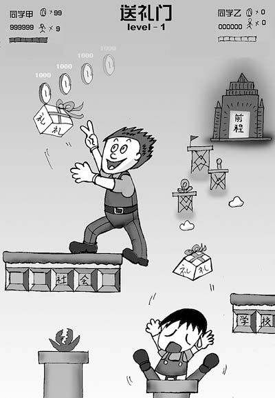 武汉某高校的小刘一直挺看不起那些送礼的同学:“不管怎样,总有点溜须拍马之嫌。”可是,很快他就明白了自己“清高”的代价。本来属于自己的特等奖学金,却给了因为“两条芙蓉王,几瓶茅台”就和辅导员“关系要好”的一个同学;本来可能拿到的保研资格,因为班上一个女生关键时刻突然“发威”,接连发表了好几篇署在某老师名字后的论文,就生生被挤出了保研的舞台……
