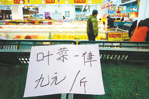 两天来,石家庄遭受54年一遇的特大暴雪,对交通、水电、农业等行业造成重大影响,人们纷纷采取集中采购食品的方式应对“雪灾”,以至蔬菜价格上涨。在石家庄一家超市,叶菜卖到9元/斤。