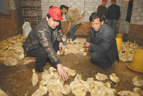 华中农业大学志愿者、兽医博士周祖涛(前左)在通山县九宫山镇为烈士陈及时的父亲提供家禽饲养技术指导(11月10日摄)。
