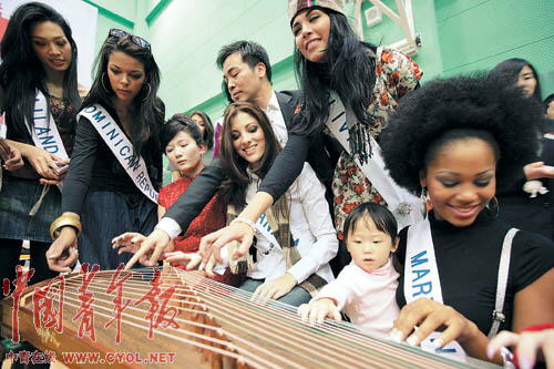 11月14日,来中国参加第49届国际小姐大会总决赛的70多名“美丽使者”与北京加拿大国际学校和北京中加学校的学生联欢,共同分享爱的主题。