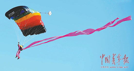 八一跳伞大队在表演“七仙女下凡”项目时从空中徐徐飘下。本报记者 刘占坤摄
