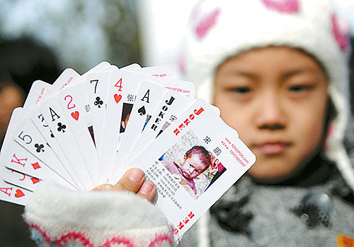 11月15日,河北邢台,当地爱心协会的志愿者向群众发放“寻亲扑克”,帮助失散家庭寻找失踪的亲人。以前,在大街上经常看到贴在电线杆上寻人启事,一幅幅失踪小孩或老人的照片,让人很是揪心。自愿者的爱心让人感动,他们用这种特殊的传播方式提醒大家,每个人多留一分心,失踪的亲人就能早日与家人团聚。