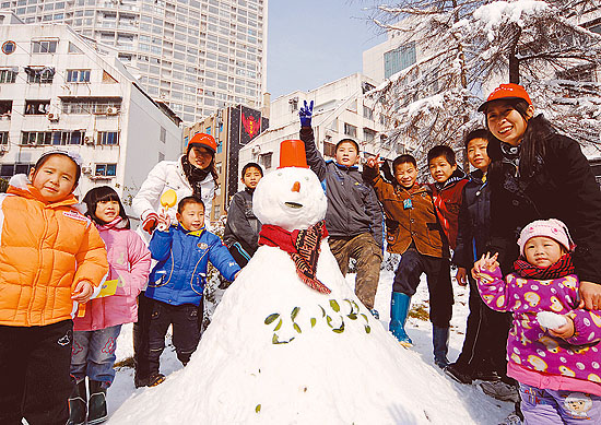 11月17日,“志愿家长”带领停课的中小学生在社区内堆雪人。受11月16日暴雪影响,合肥市中小学校停课放假两天。该市亳州城社区居委会组织社区志愿者临时担任“志愿家长”,组织停课的学生学习、做游戏,帮家长解决后顾之忧。虞俊杰摄(新华社发)