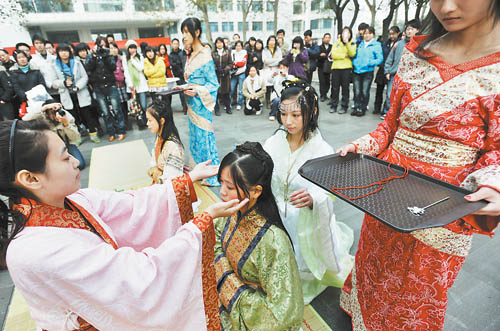 11月20日,一群身穿传统服装的大学生在华中师范大学上演了一场“汉服秀”和冠礼(男子成年礼)、笄礼(女子成年礼)表演。活动组织者表示,这次表演是希望唤起同学们对汉族传统文化的重视与兴趣。