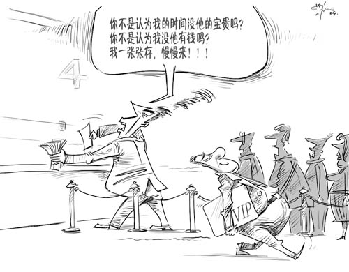 11月21日,一客户为报复海口一家银行的工作人员让VIP客户“插队”办理业务,“霸占”其中一个柜台窗口,连续办理数百笔“一元钱存款”业务,历时5个多小时。(人民网11月23日)