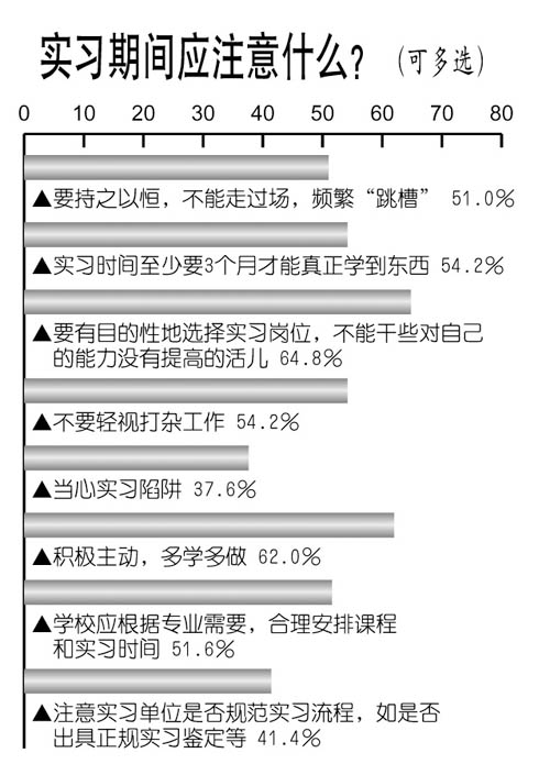 大学生在实习期间应该注意什么?调查中,62.0%的人建议实习要积极主动,多学多做;54.2%的人建议实习生不要轻视打杂工作;54.2%的人认为实习至少要3个月才能真正学到东西;51.0%的人认为实习要持之以恒,不能频繁“跳槽”。