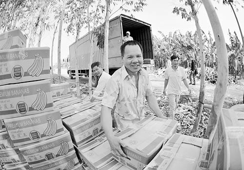 11月25日,在广西武鸣县宁武镇张朗村,蕉农将香蕉搬上货车。