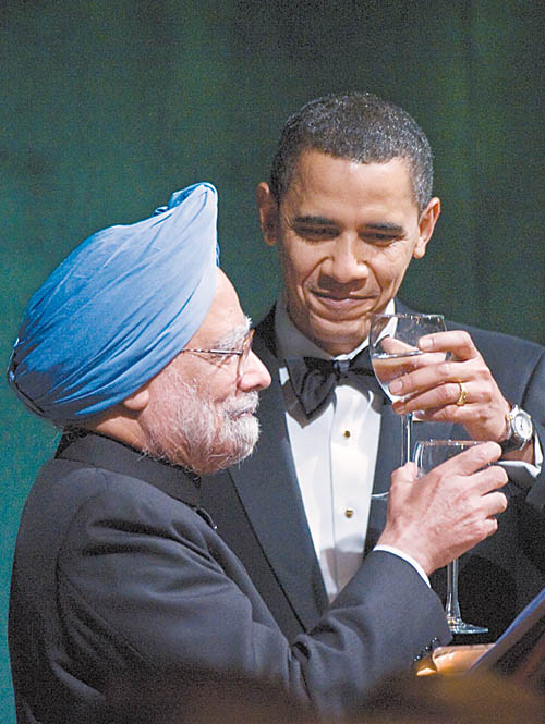美国总统奥巴马(右)24日晚在白宫南草坪举行的就任后首场国宴上向印度总理辛格祝酒。奥巴马当天称,印度是美国“不可或缺”的伙伴。