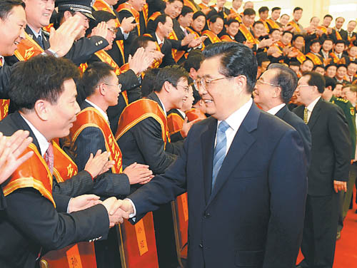 胡锦涛、温家宝、李长春等党和国家领导人会前亲切会见了受表彰的全国优秀复员退伍军人。