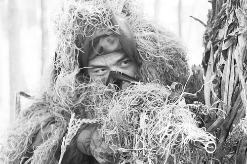 身穿伪装服的战士正严密监控着“敌人”的动向。